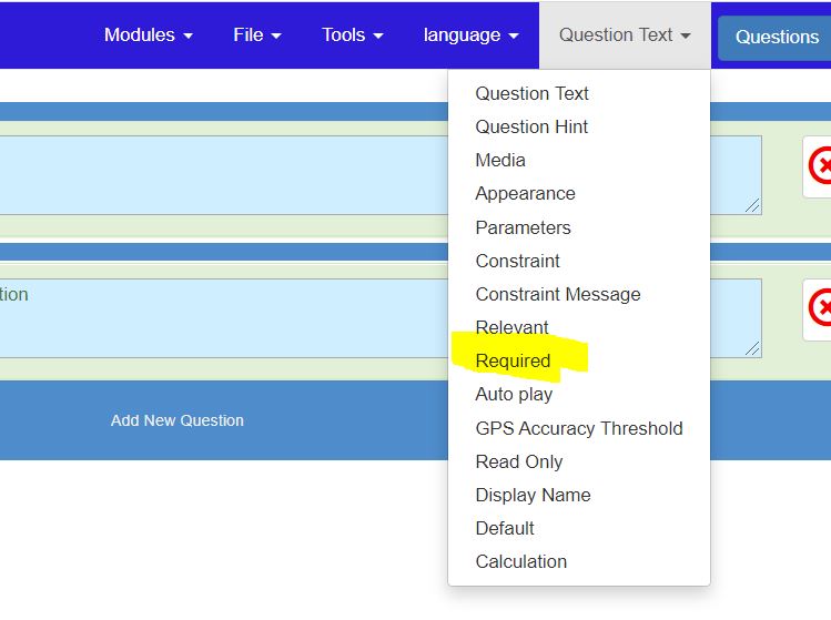 Set the property to be edited to Required. The properties menu shows the property that is currently selected , the default property is Question Text.